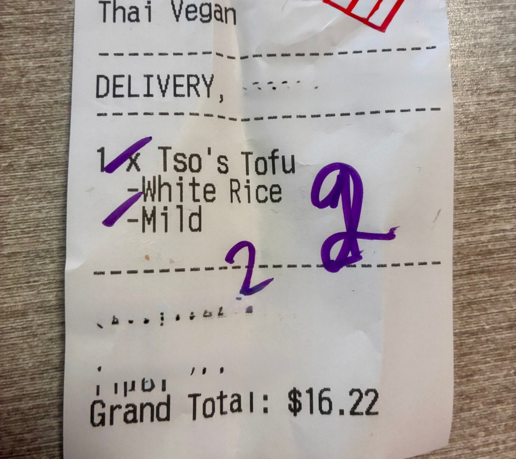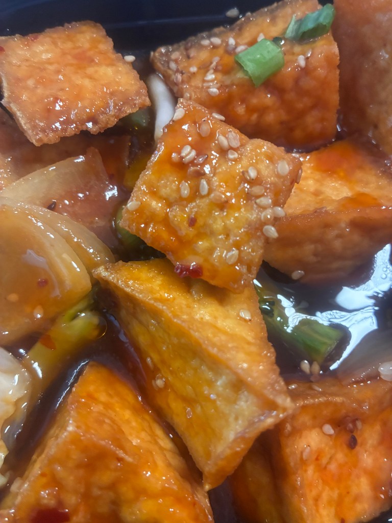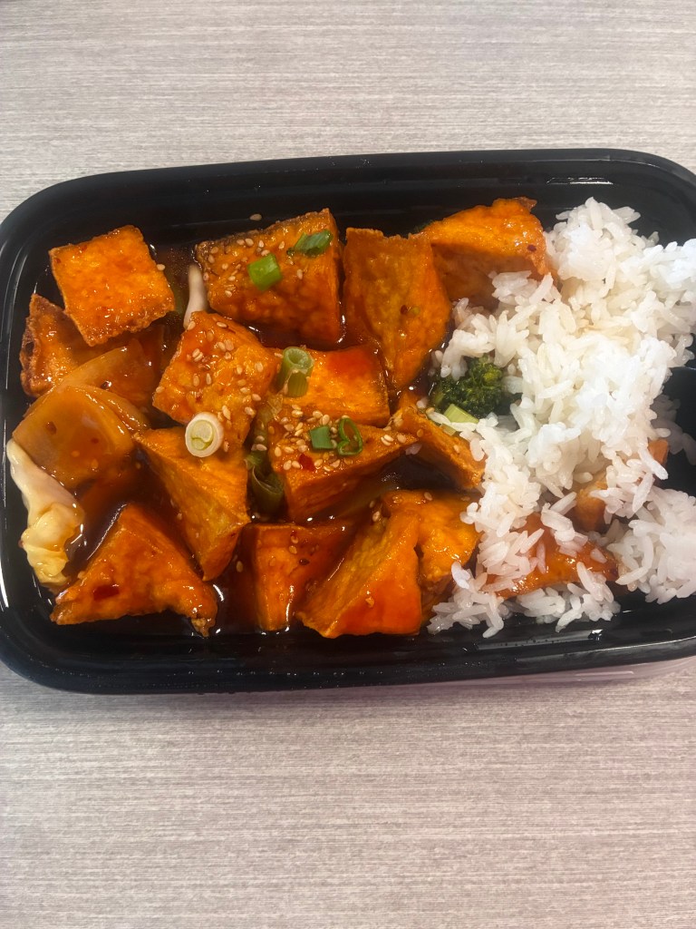 These juicy Tofu pieces were a nice filling size, cut in triangles. Underneath were crunchy onions. As I said before, I’m not a “white” rice kind of person, but in this sauce…it was divine! My taste buds were VERY happy with my meal.